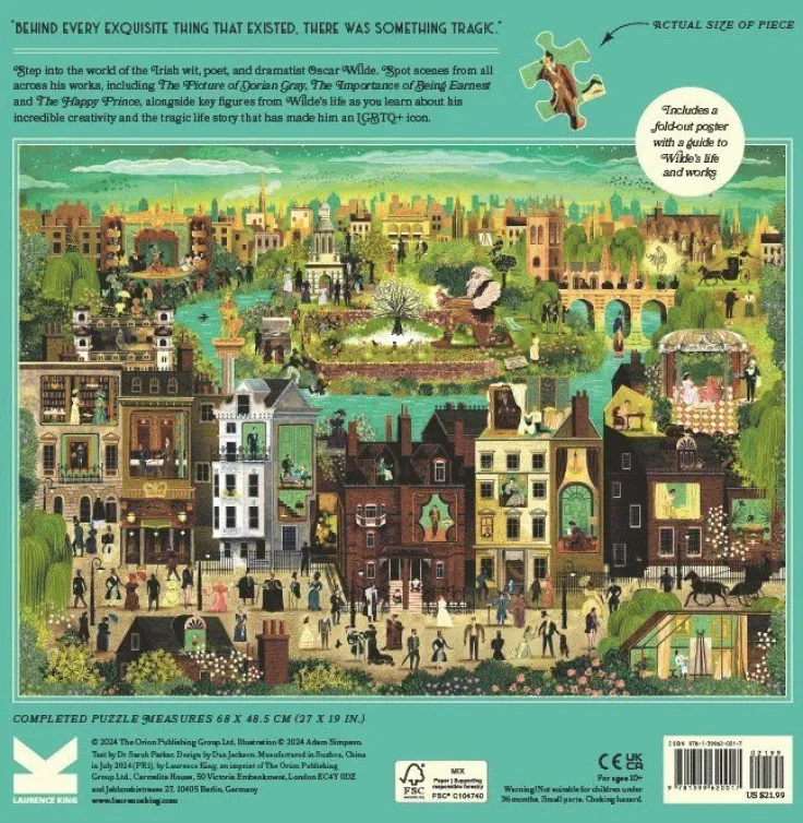 Pussel med 1000 bitar i stadig kvadratisk ask. Innehåller en utvikbar affisch med pusslets bild och med en beskrivning av alla karaktärer och deras historier. Kliv in i världen av den irländske kvickheten, poeten och dramatikern Oscar Wilde. Upptäck scener från hans verk, inklusive Dorian Grays porträtt, Mister Ernest och Den lyckliga prinsen, tillsammans med nyckelfigurer från Wildes liv, medan du lär dig om hans otroliga kreativitet och den tragiska livshistoria som gjort honom till en HBTQ-ikon.Pusslet mäter 68 x 48,5 cm när det är klart.
