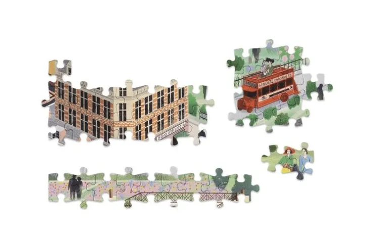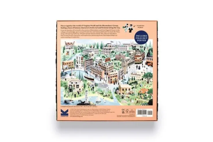 Pussel med 1000 bitar i stadig kvadratisk ask. Innehåller en utvikbar affisch med pusslets bild och med en beskrivning av alla karaktärer och deras historier.Från Cornwalls stränder till Bloomsburys gator och från Hogarth House till Cambridges kollegier, upptäck Leonard Woolf, Clive och Vanessa Bell samt Vita Sackville-West, tillsammans med Clarissa Dalloway, Orlando och Ramsay-familjen. Dessutom, upptäck de platser som formade Woolfs karaktär och inspirerade hennes banbrytande böcker som hjälpte till att forma vår förståelse av modernitet.Pusslet är en perfekt present till alla Virginia Wolf fans!Pusslet mäter 48,5 x 68 cm när det är klart.