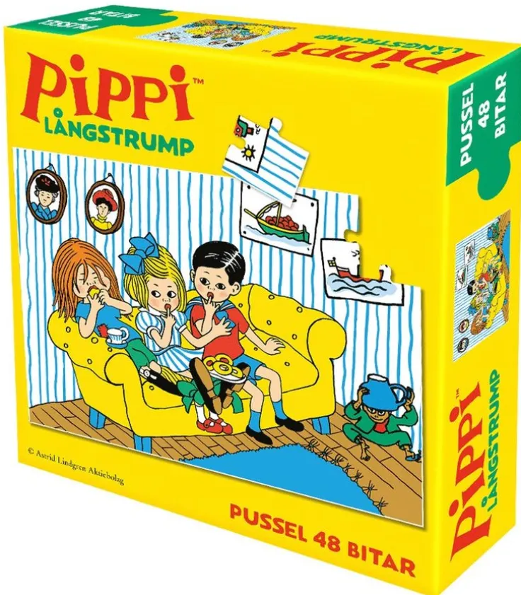 Pippi är på kalas hemma hos Tommy och Annika! Färgglatt och roligt motiv att pussla ihop. En liten och behändig pussellåda. 48 bitar. Illustration av Ingrid Vang Nyman.