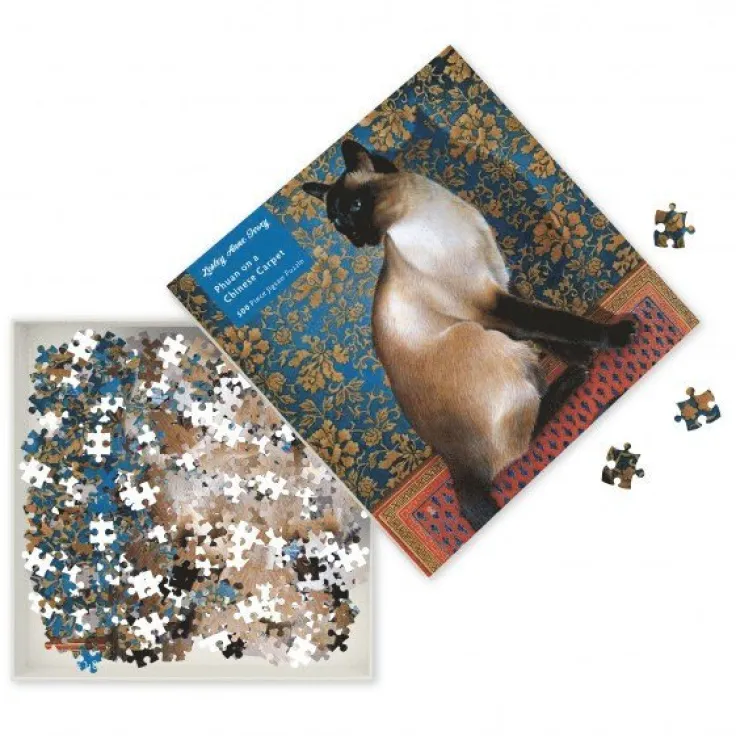 Pussel med 500-bitar i en stadig och dekorativ ask. Pusselbitarna är i kraftig kartong och med en len yta, fina att hålla i. Asken innehåller en exakt bild av det färdiga pusslet. Bra att ha tillhands som referens. Det färdiga pusslet mäter 490 x 360 mm. Vacker bild av den charmiga katten Phuan på en kinesisk matta av konstnären Lesley Ann Ivory. Tydliga färgfält som gör pusslandet både intressant och roligt.