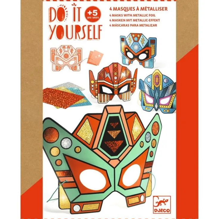 Ett pyssel kit där ni får 4 coola robotmasker att dekorera med metallglänsande folie. Maskerna har självhäftande områden täckta med individuella skyddspapper som du drar bort en i taget för att sedan lägga på ett av arken med folie och trycka till så att det fastnar i klistret och får masken att börja glimra. En enkel aktivitet som är perfekt för att sysselsätta en grupp barn, exempelvis på ett kalas. Det ingår ett häfte med steg-för-steg instruktioner i färgbilder som guidar barnen genom aktiviteten och som också förklarar vilken färgkod som motsvarar vilken färg på folien. Kittet innehåller: 4 masker, 30 överförings-ark med metallglänsande folie i flera olika färger och mönster, 4 elastiska snoddar i olika färger, samt ett häfte med instruktioner. Tillverkat av FSC®? certifierad kartong och papper. Varje robotmask är ungefär 16 x 22 cm stor och de metalliskt gnistrande områdena kommer att ge dem en snygg effekt.