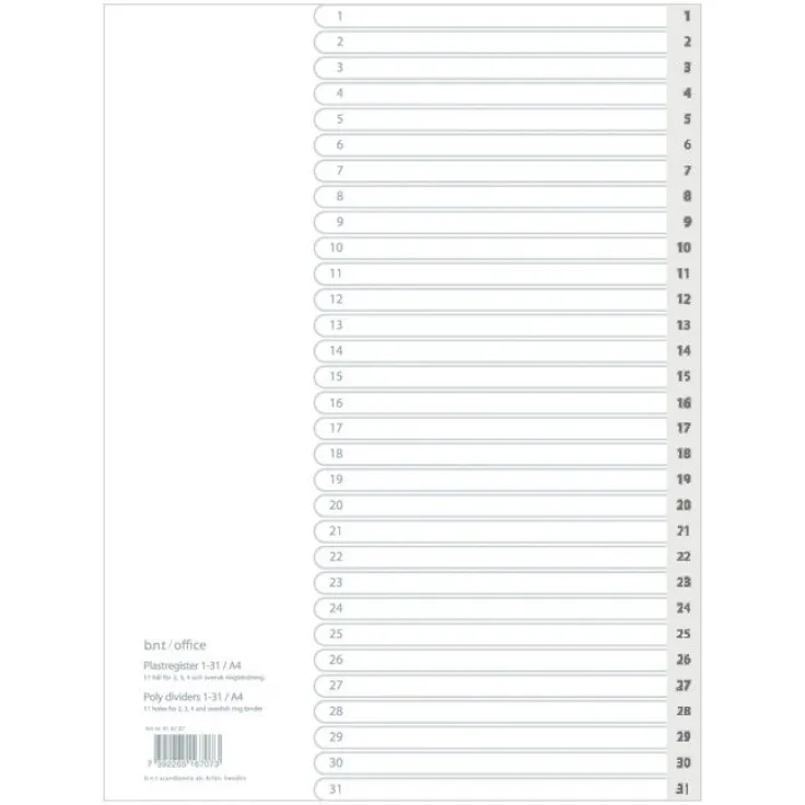 Plastregister 1-31, flikar med indexsida i papper. 11 håls multihålning för 2,3,4 och Svenskt hålavstånd.