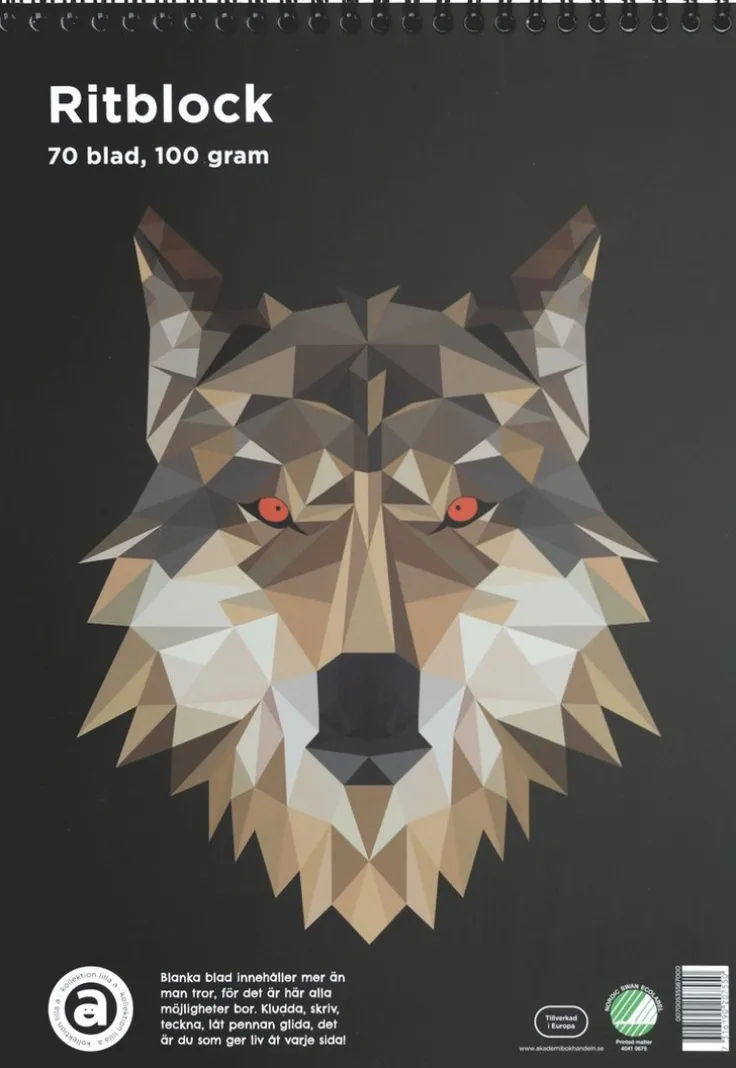 Spiralbundet ritblock med ett vargmotiv i A4-format. Låt kreativiten flöda över ritblockets tjocka, blanka blad som passar både till färg- och tuschpennor, kritor och vattenfärger. Svanenmärkt. Tillverkad i Europa. 70 blad. Ge familjens yngsta medlemmar utrymme för sin fantasi i det här ritblocket. Ingår i Akademibokhandelns egen kollektion – Kollektion lilla a.