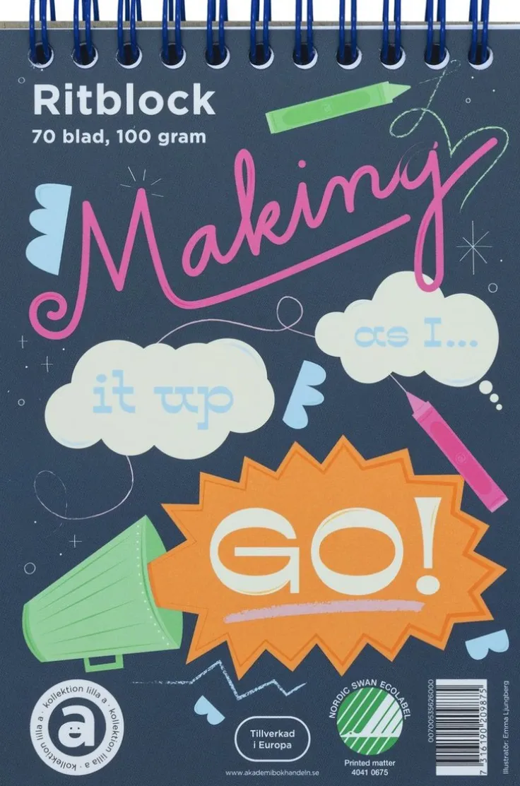 Svanenmärkt.Tillverkad i Europa.70 blad.Unikt illustrerad av Emma Ljungberg för Akademibokhandeln. Ritblocket ingår i Akademibokhandelns egen kollektion – Kollektion lilla a.