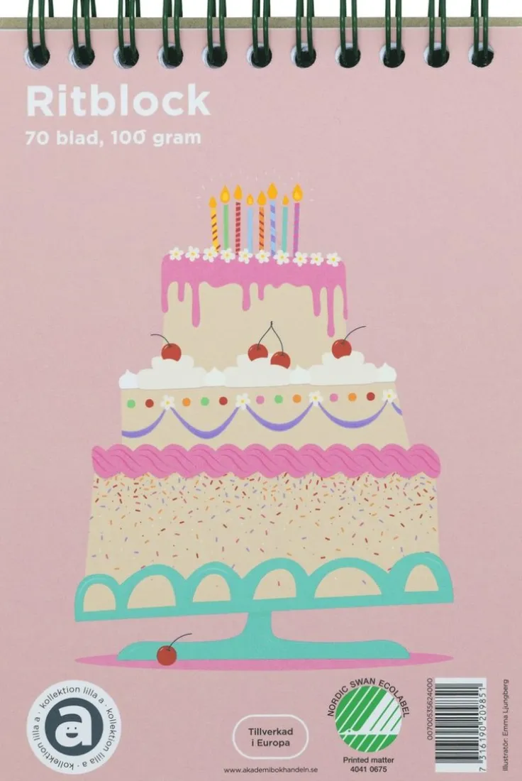 Spiralbundet ritblock i A6-format med motiv av en färgglad födelsedagstårta mot rosa bakgrund. Ritblocket har 70 tjocka och blanka blad att fylla med allt mellan himmel och jord. Passar lika bra till kritor som till vattenfärg, tusch-och färgpennor.Svanenmärkt.Tillverkad i Europa.70 blad.Unikt illustrerad av Emma Ljungberg för Akademibokhandeln. Ritblocket ingår i Akademibokhandelns egen kollektion – Kollektion lilla a.