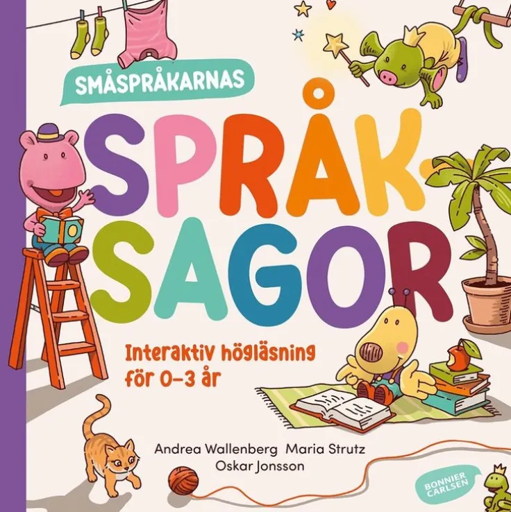 Stötta ditt barns språkutveckling och upptäck berättandet – den viktigaste språkkompetensen! Läs, lek och hitta berättarglädjen tillsammans med Haja, Hoa och Mim. ”Småspråkarnas språksagor”, skriven av logopederna Andrea Wallenberg och Maria Strutz och illustrerad av Oskar Jonsson, innehåller sex interaktiva sagor som på ett lekfullt sätt främjar språkutvecklingen hos de allra yngsta. Följ med Småspråkarna till bondgården, sortera leksakerna och utforska det viktiga ordet ”nej”. Alla sagor är skrivna så att det ska gå att interagera med dem på något vis. Lek, gissa, välj själva, fyll i och fantisera. Hitta små stunder i vardagen där ni upptäcker hur roligt det kan vara att läsa och berätta ihop. Boken stöttar det lilla barnets språk- och berättarglädje – allt medan ni har kul tillsammans!