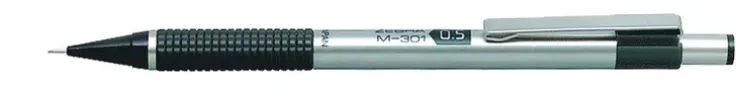 Elegant stiftpenna i metall med ett räfflat behagligt plastgrepp. Metallclips. Radergummi i bakre änden av pennan. Klassiskt utseende. 0.5 mm.