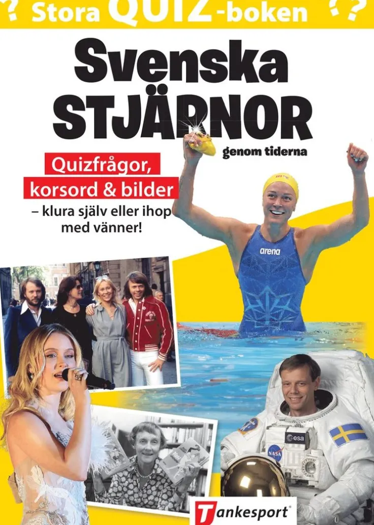 I Stora quizboken Svenska stjärnor kan du testa dina kunskaper om stora idoler genom tiderna inom såväl sport som på vita duken, teknik, musik, litteratur och konst.