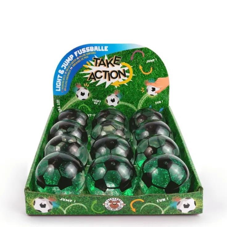 En cool liten genomskinlig fotboll som vid varje studs eller skakning fylls med en effektfull virvel av glitterkonfetti som liknar gräs. Vid en kraftigare studs lyser bollen dessutom upp med blinkande blå och gröna ljuseffekter i en häftig liten ljusshow som blir extra spektakulär i mörker! Bollen är fylld med vatten, och en vattentät inre boll rymmer lysdioderna samt de tre batterierna (LR1130), som inte kan bytas ut. Vuxen tillsyn rekommenderas. Upplev lysande nöje på studs!