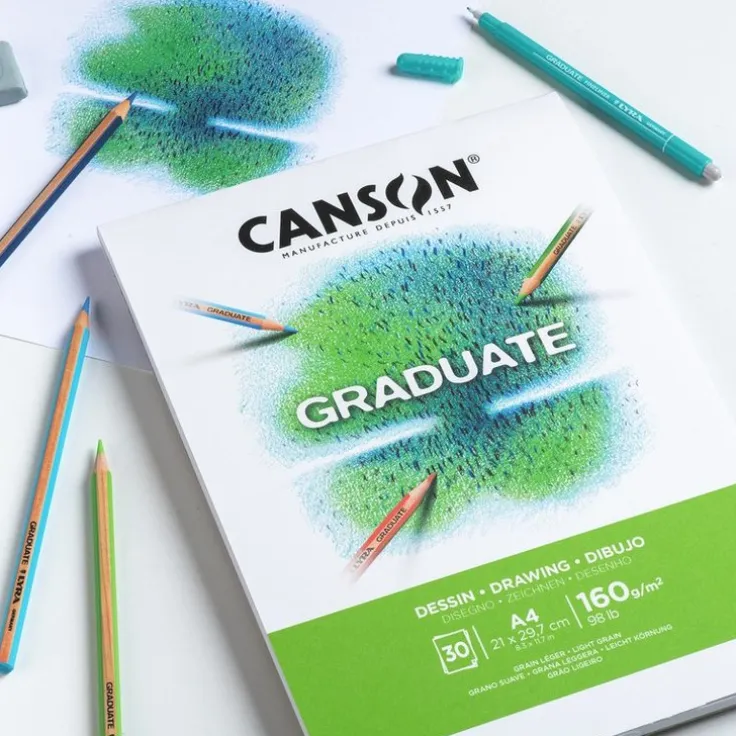 Canson® Graduate Rit Block i A4 format har slitstarkt och lätt texturerat vitt ritpapper. Hållbar yta som tål att suddas upprepade gånger. Det innehåller 30 ark, perfekt för att rita med penna, pastell, markörer eller kol. Syrafritt och FSC-certifierat papper tillverkat i Frankrike.