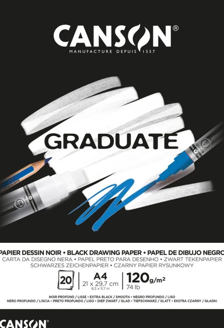 Canson Graduate Svart papper block A4 120G 20 arkCanson Graduate Block med svart papper innehåller 20 ark 120 gram slätt svart papper som är idealiskt för användning med grafit och färgpennor, fiberspetspennor, akrylpennor och många andra tekniker.Syrafritt FSC-certifierat papper tillverkat i Frankrike. Canson grundades i Frankrike av familjen Montgolfier och har tillverkat papper sedan 1557. De anses vara en av världens främsta tillverkare och levererar till alla nivåer från skolor till professionella konstnärer.