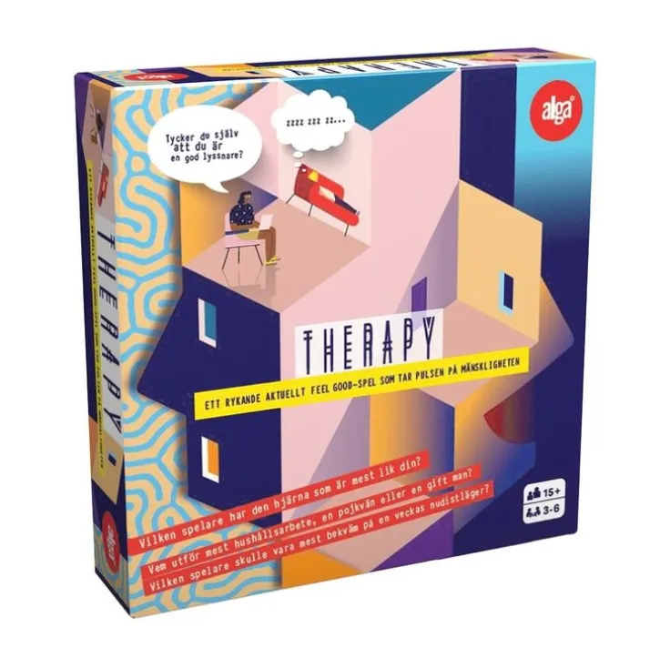 Ett feel goodspel som tar pulsen på mänskligheten. En daglig dos Therapy ordineras. Trolig biverkning: Oväntade sanningar med risk för skratt. Här blandas högt med lågt, sant med falskt och skoj med allvar. Flytta din soffa runt spelplanen i jakten på psykisk balans. Genom samtal med coachen, gruppterapin och insikter om dig själv och dina medspelare blir du av med nojor och tvångstankar – och får plocka bort markörer från din soffa. Djupdyk i personliga reflektioner och förundras över generella mänskliga – väldigt aktuella – beteenden. Vinner gör spelaren som svarar rätt på frågorna och bäst kan bedöma sig själv och sina medpatienter. Innehållet har skrivits av två psykologer och en författare.