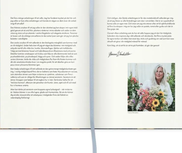 Hanna Wendelbo är en formgivare med specialkompetens inom mönsterdesign, med har även ett klappande hjärta för blommor och trädgård. Hon har en gedigen erfarenhet av blomsterodling och hon vet allt om hur du lyckas – med frön, plantor och knölar, med skötsel, skörd och användning – oavsett om du odlar på friland, i rabatt eller pallkrage.Trädgårdskalendern är en odaterad kalender som följer med dig från år till år och ger dig en plats att samla alla dina odlingsanteckningar. Varje månad delar Hanna med sig av värdefulla tips för odlingen, inklusive förberedelser inför säsongen, rekommenderade blomsorter och grönsaker, samt råd om hur du tar hand om dina växter.I Trädgårdskalendern får du möjlighet att dokumentera din planering, notera vilka sorter du odlar, följa hur det går och till och med skissa på hur du vill designa din trädgård. Genom att samla all denna information får du en fantastisk grund inför nästa odlingssäsong och kan bygga vidare på tidigare erfarenheter för att skapa en ännu vackrare och mer produktiv trädgård.Format: A5. Layout: Liggande. Vecka/uppslag. Omslag: Kartong. Inbunden. Detaljer: Gummiband. Märkband. Antal sidor: 160. Pappersvikt: 90 g. Miljöinformation: FSC®. Varumärke: Stora A.