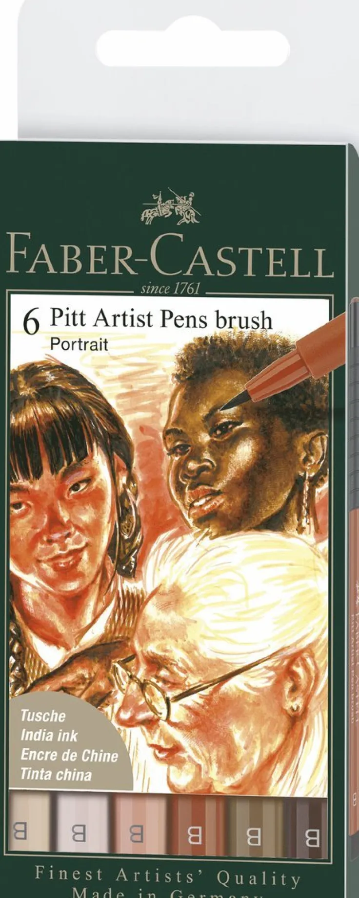 Pitt Artist Pen Brush India ink pen, ask med 6 penselpennor, Portrait. Porträtt set med färger som är kompatibla med olika nyanser av hud, hår och läppar. Fantastiska penselpennor med högpigmenterat India ink. Ljusäkta. Lång och metallomsluten spets. Vattentåligt och permanent bläck. Lukftfritt, syrafritt och pH-neutralt. Blöder inte igenom papper. Pitt Artist serien är en global storfavorit bland både proffesionella och amatörkonstnärer tack vare dess höga kvalitet och följsamma och tåliga spetsar. Pitt Artist pennorna är perfekta för bl.a. sketcher, teckningar, layout, mode-design och illustrationer.