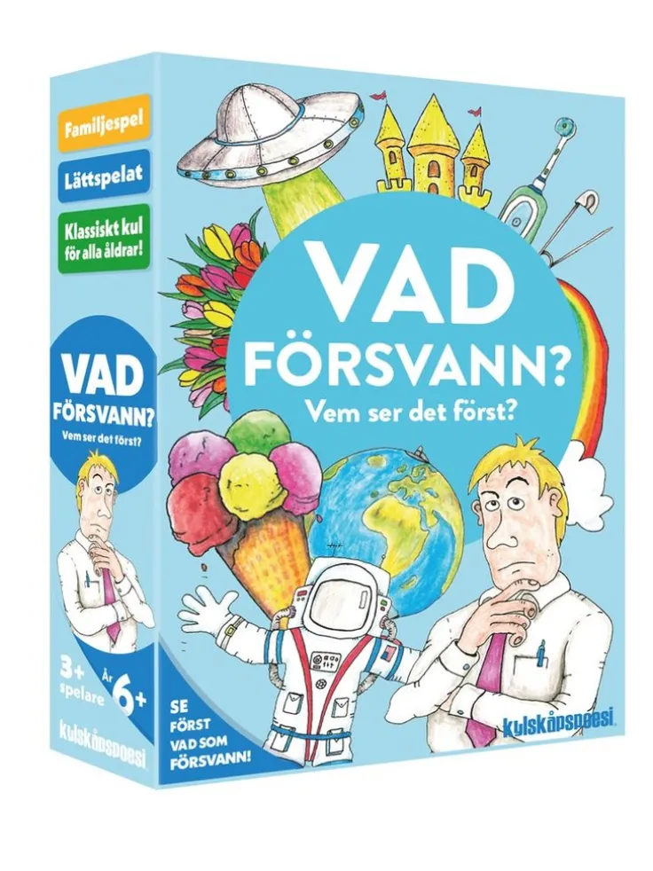 Vad försvann? är ett lättspelat och kul spel som snabbt blir allas favorit. Utmana familj och vänner och se vem som snabbast upptäcker vad som försvinner från bordet. Sprid ut korten framför er och försök komma ihåg vad som ligger var. Blunda när spelledaren tar bort ett kort och räkna sedan till tre och titta. Nu gäller det! Vem ser först vad som försvann? Vad försvann? är ett helkul spel som passar alla åldrar – lika kul på förfesten som på barnkalaset! Här spelar alla mot alla och ju fler desto roligare! Perfekt för hemmakvällen, festen eller middagen.
