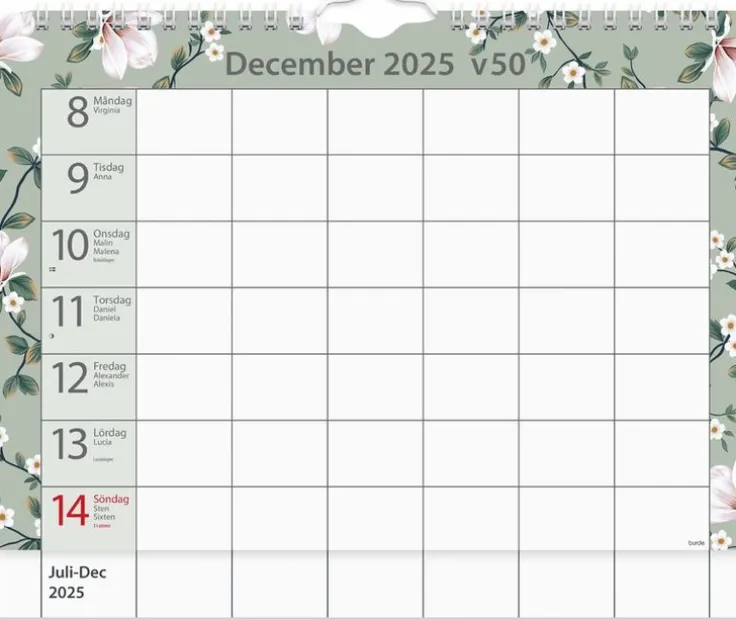 En vägghängd familjekalender i A4-format med 6 kolumner för olika aktiviteter eller familjemedlemmar. För varje blad har du en översikt över veckan och kan med lätthet planera och strukturera alla veckans aktiviteter, födelsedagar, måltider och allt annat som behövs för att få ihop livspusslet. Anteckna aktiviteten eller familjemedlemmarnas namn längst ner, där du bara behöver skriva in dem en gång.Väggkalender 25/26 från Burde. Format: A4. Layout: Stående. Vecka/uppslag. Kalendarium: 2025-07-07 – 2026-07-12. Omslag: Kartong. Spiralbunden. Innehåll: 6 kolumner. Antal sidor: 52. Miljöinformation: FSC®.