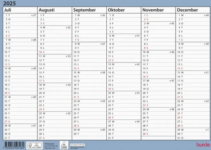 Få en överblick över året med detta stilrena väggblad. Perfekt för att hålla koll på födelsedagar, högtider och andra viktiga datum.Väggkalender 25/26 från Burde. Format: 297×210 mm. Layout: Stående. Halvår/sida. Kalendarium: 2025-07-01 – 2026-06-30. Omslag: Kartong. Antal sidor: 1. Miljöinformation: FSC®.