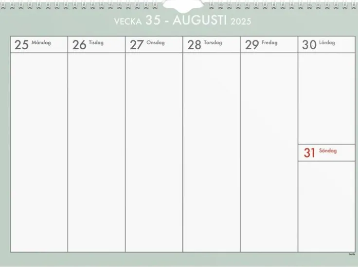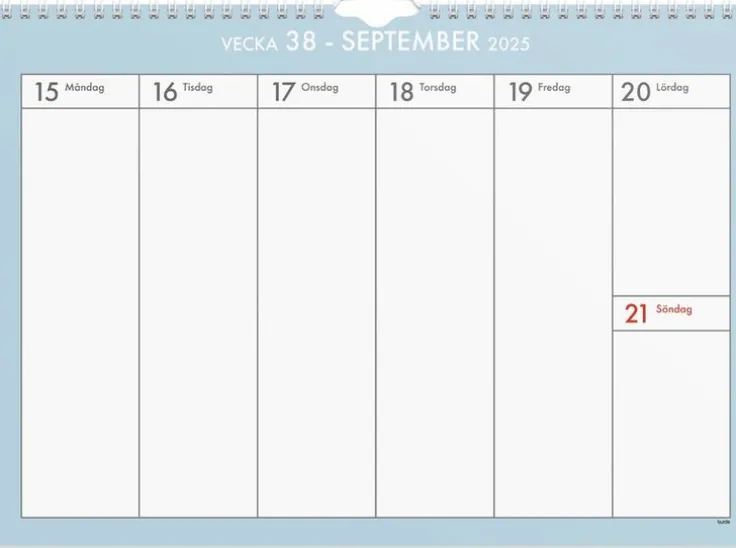 Veckoplan är en väggkalender i A3-format med vertikalt orienterat veckouppslag med mycket noteringsyta. Varje blad täcker in en vecka och kommer i olika färgteman.Väggkalender 25/26 från Burde. Format: A3. Layout: Stående. Vecka/uppslag. Kalendarium: 2025-07-07 – 2026-07-12. Omslag: Kartong. Spiralbunden. Antal sidor: 52. Miljöinformation: FSC®.