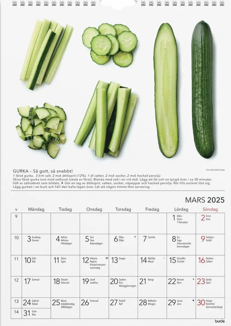 Väggkalender med bilder på frukter eller grönsaker som lämpar sig för månaden. Till det även ett smart, passande tips.Väggkalender 2025 från Burde. Format: A4. Layout: Månad/blad. Kalendarium: 2025-01-01 – 2025-12-31. Spiralbunden. Antal sidor: 12. Miljöinformation: FSC®.