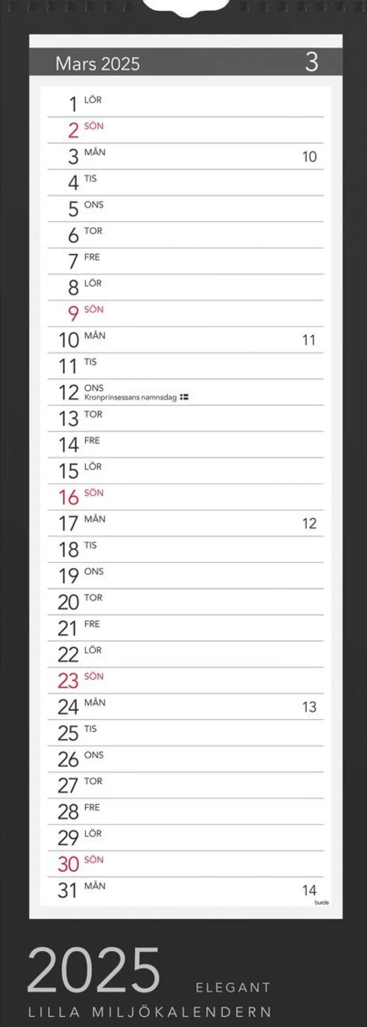 Väggkalender 2025 från Burde. Format: 175×490 mm. Layout: Månad/blad. Kalendarium: 2025-01-01 – 2025-12-31. Spiralbunden. Antal sidor: 12. Miljöinformation: FSC®.