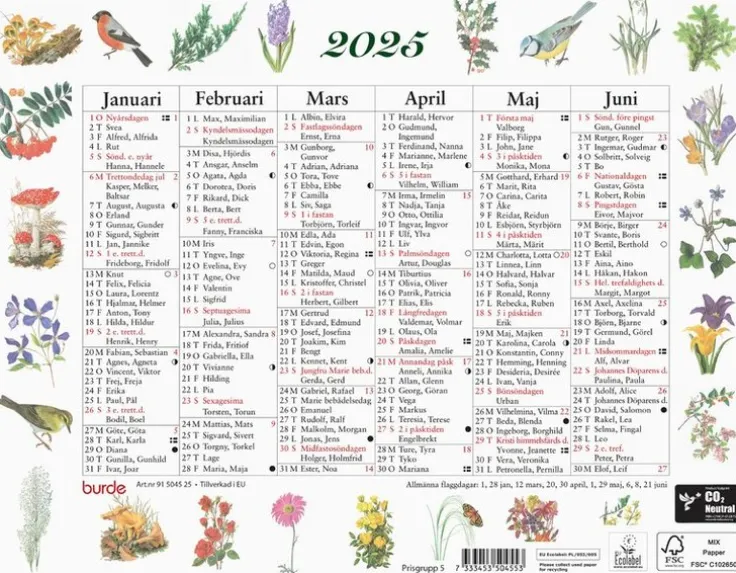Väggkalender 2025 från Burde. Format: 245×190 mm. Layout: Halvår/sida. Kalendarium: 2025-01-01 – 2025-12-31. Innehåll: Namnsdagar. Antal sidor: 2. Miljöinformation: FSC®. Klimatkompenserad. Ecolabel. Klimatkompenserad.