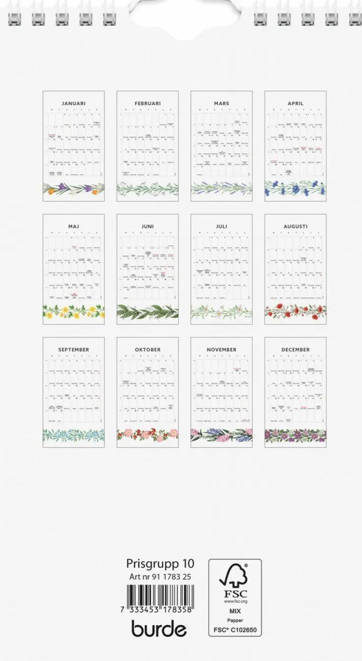Liten, lättplacerad väggkalender med söt blomsterkrans som pyntar kalendariet. I månadskalendariet finns möjlighet att anteckna.Väggkalender 2025 från Burde. Format: 120×215 mm. Layout: Månad/blad. Kalendarium: 2025-01-01 – 2025-12-31. Omslag: Papper. Spiralbunden. Antal sidor: 12. Miljöinformation: FSC®.
