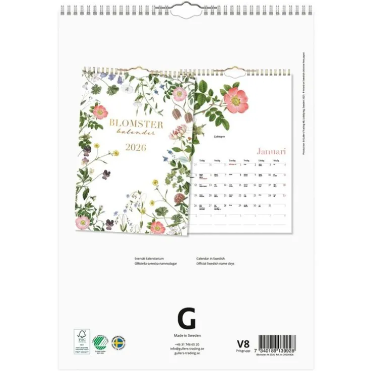 Väggkalender Blomster A4 2026. Motiv av växter illustrerade av C.A.M. Lindman i början av 1900-talet. Svenska namndagar och helgdagar. Kalendern är producerad och tryckt i Sverige på svenskt papper. Märkt med både Svanen och FSC.