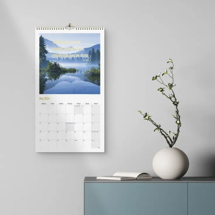 En vacker vägghängd kalender där varje månadsbild är som en tavla i sig. Planera in månadens göromål och njut av naturbilderna med tänkvärda citat, präglade i guldfolie. Kalendern ger dig en bra överblick och underlättar planeringen för både vardag och helg.>Väggkalender 2026 från Burde. Format: 250×450 mm. Layout: Månad/blad. Kalendarium: 2026-01-01 – 2026-12-31. Spiralbunden. Innehåll: Flaggdagar, helgdagar/aftnar,. Antal sidor: 12. Miljöinformation: FSC®.