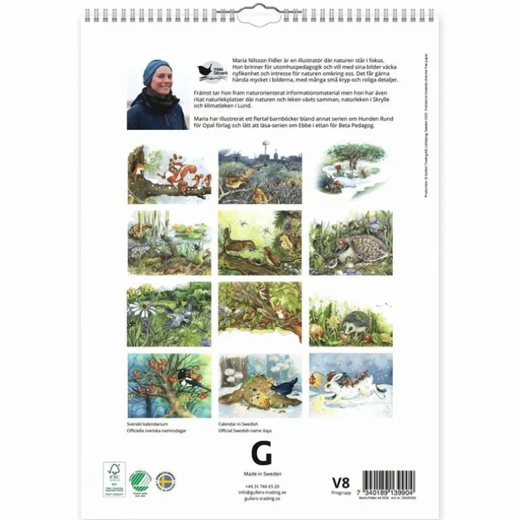 Väggkalender Maria Fidler 2026 med tolv härliga bilder av författaren och illustratören Maria Fidler. Svenska namndagar och helgdagar. Kalendern är producerad och tryckt i Sverige på svenskt papper. Märkt med både Svanen och FSC.