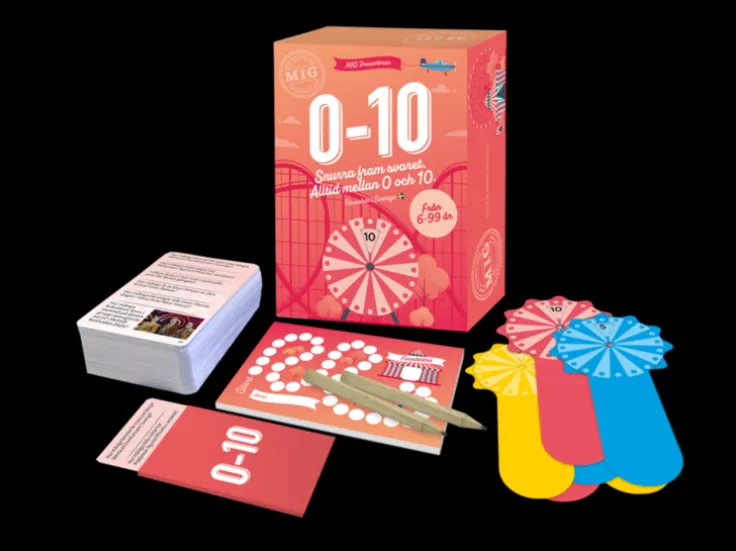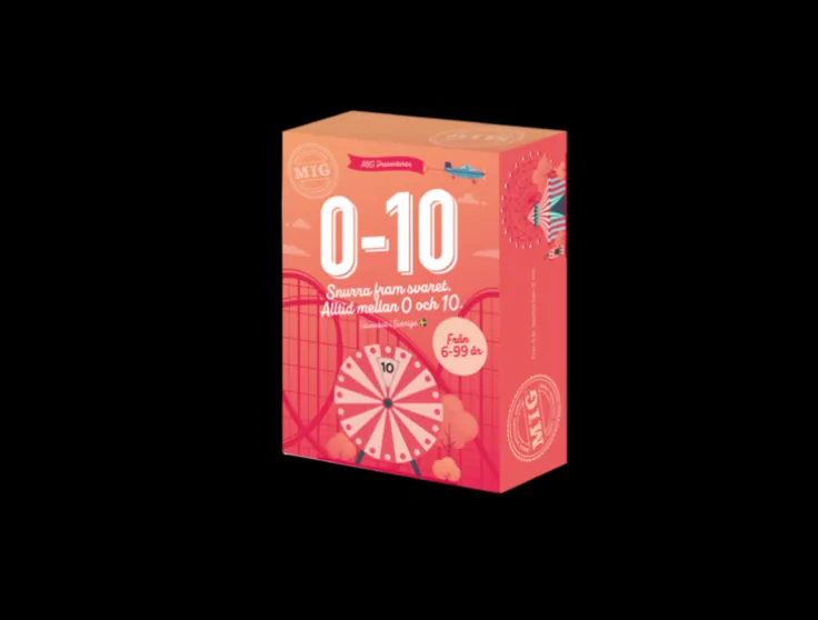 Utmana familj och vänner i 0-10 som är ett helt nytt spelkoncept från Playmig. I det här spelet kan alla vara med och alla har ett svar. Spelarna använder en talsnurra för att visa sina svar och de som svarar rätt eller är nära får gå mot målet. Frågekorten blandas upp med roliga bildfrågor. 0-10 är ett snabbt spel som är lätt att ta med. Tillverkad i Sverige av Playmig. Spelet innehåller: 450 frågor, kortficka, 6 talsnurror, block och pennor. Speltid 15-30 minuter. Antal spelare: 2-6 spelare