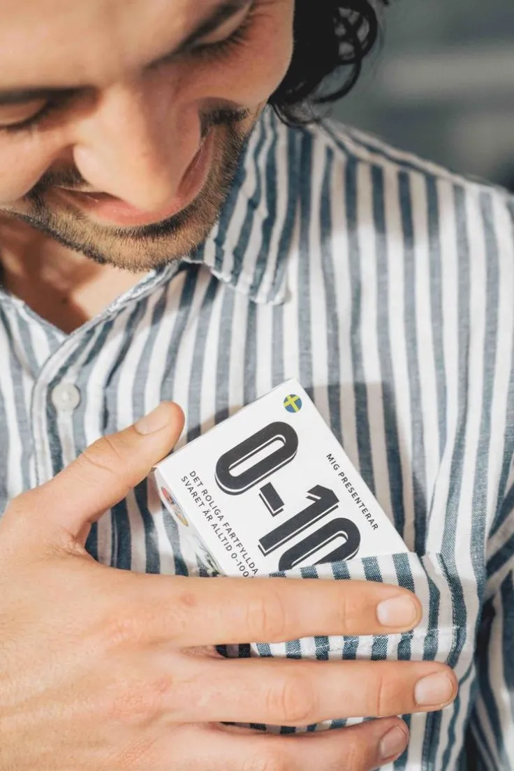 Här är spelet där ingen längre behöver sitta utan att ha ett svar! Mini 0-100 är succespelet i en liten kartong fylld med roliga och aktuella frågor. Svaret är alltid är ett tal mellan 0-100. Här får spelarna tänka brett och fritt utifrån sina kunskaper och erfarenheter. Väger endast 66 gram och är superlätt att packa med och det är enkelt att spela. Tillverkad i Sverige av Playmig. Innehåll: 175 frågor, poängblock, spelkortsficka och regler. Spela 2- flera spelare. Eller spela i lag. Speltid från 10 min