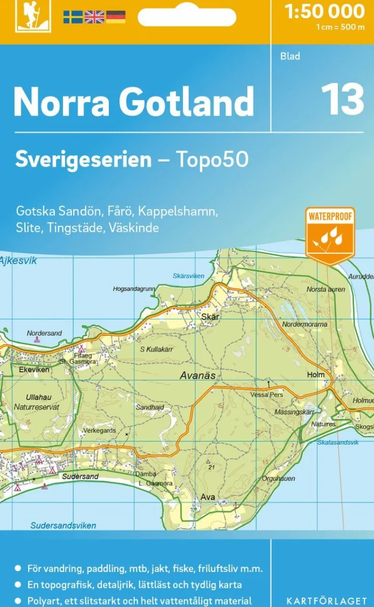 Sverigeserien är en kvalitetskarta som är gjord för att användas! Aktuellt kartdata är hämtat från Lantmäteriet och den är tryckt på Polyart som är helt vattentåligt och slitstarkt. Det mjuka materialet tål att vikas om och om igen. Den klarar både vinterns och sommarens ibland utmanande väder i Sverige. Kartorna har en utförlig teckenförklaring på svenska, engelska och tyska.