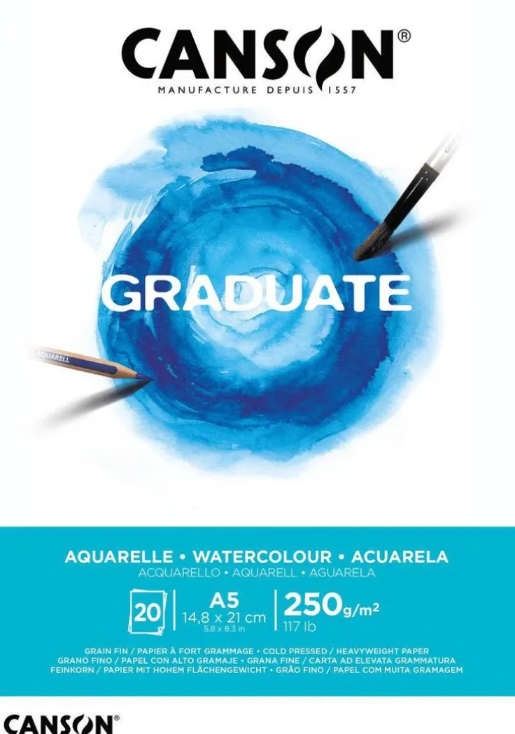 Canson® Graduate Akvarellblock i A5 format innehåller 20 ark 250 g/m2 vitt, slitstarkt papper i fin gräng. Den är perfekt för akvarellmålning. Syrafritt och FSC-certifierat papper tillverkat i Frankrike.