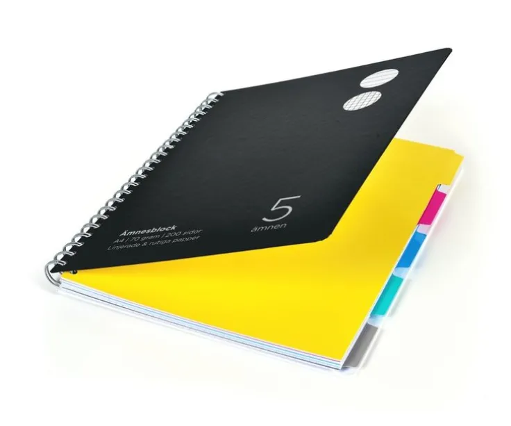 5-ämnesblock i A4-format. Blocket har 200 sidor, Omslag i kartong och fem avdelare med synlig flik i kartong. Tre av avsnitten har linjerade blad, resterande två har rutade blad.70 g linjerat och rutat papper.Miljömärkt.Ett anteckningsblock i smidigt format som lätt ryms i väskan. Passar perfekt för elever med många ämnen att hålla reda på samtidigt. Ingår i Akademibokhandelns egen kollektion – Kollektion Stora A.