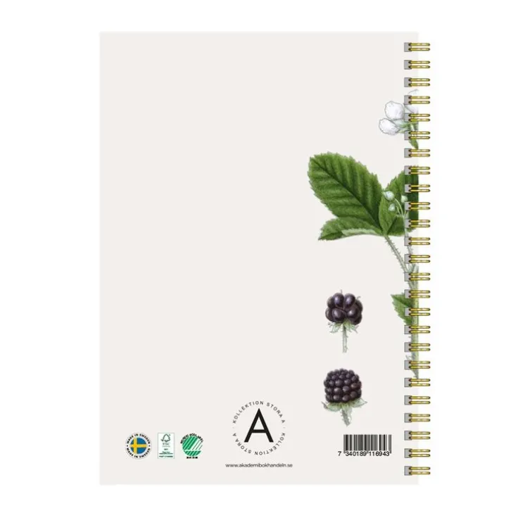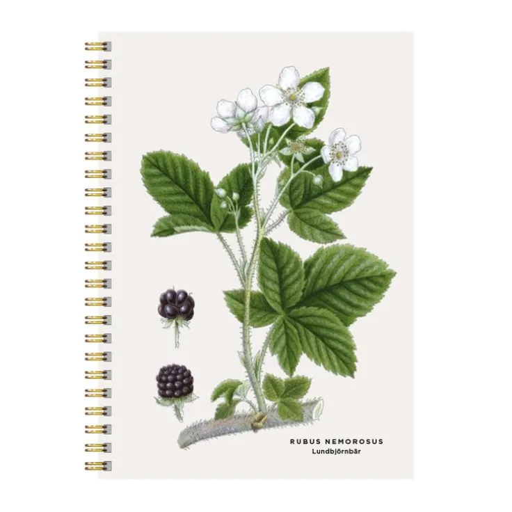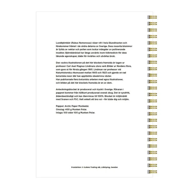 Om anteckningsblockets motiv: Lundbjörnbär (Rubus Nemorosus) växer vilt i hela Skandinavien och förekommer främst i de södra delarna av Sverige. Dess rosavita blommor är fyllda av nektar och pollen som lockar mängder av pollinerande insekter. Björnbärsblad har länge använts inom folkmedicin för dess läkande egenskaper, både för invärtes och utvärtes bruk. Den vackra illustrationen på det här blockets framsida är tagen ur professor Carl Axel Magnus Lindmans stora verk Bilder ur Nordens flora, som gavs ut för första gången 1901.