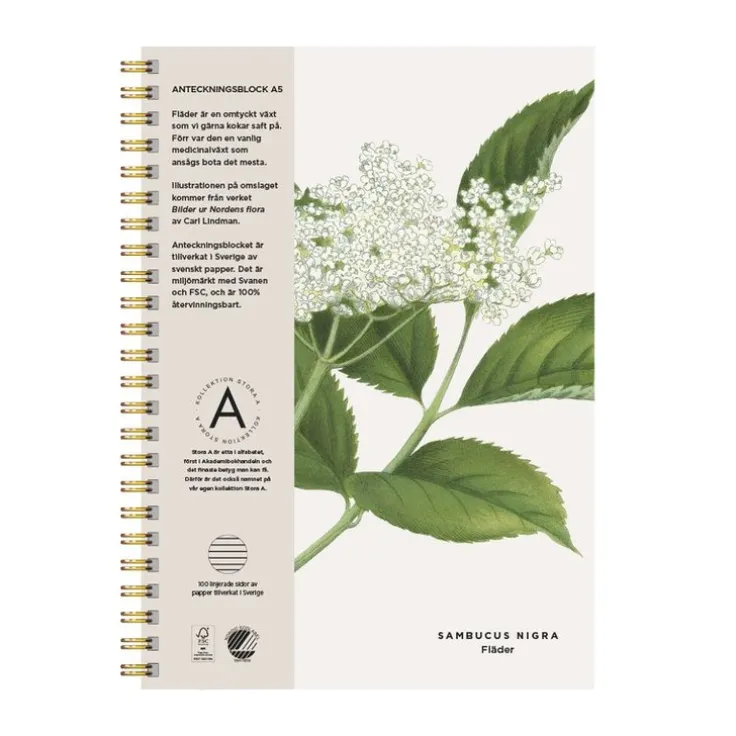 Om anteckningsblockets motiv: Fläder (Sambucus nigra) är en populär växt som man kan göra saft eller vin av. Dessutom är den en populär krydda i brännvin. Man bör känna till att fläder innehåller ett starkt gift som i kontakt med vatten bildar cyanid. Giftet försvinner som tur är när den kokas. Förr ansågs flädern skydda mot åsknedslag och bota ett stort antal sjukdomar. Den fina illustrationen på anteckningsblockets framsida är tagen ur professor Carl Axel Magnus Lindmans stora verk Bilder ur Nordens Flora som gavs ut för första gången 1901.