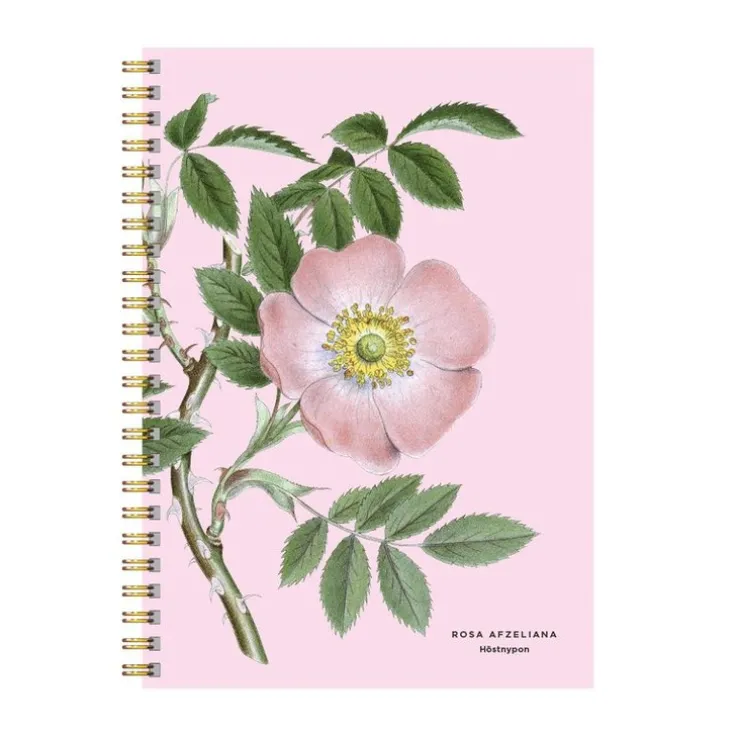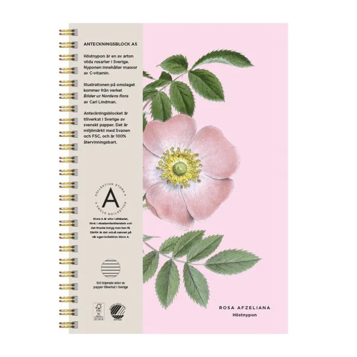Om anteckningsblockets motiv: Höstnypon (Rosa afzeliana), nyponros eller törnros är den största vilt växande rosen i Sverige. Den är vanlig i hela Europa och busken kan bli hela tre meter hög. Förr trodde man att nyponet gav god sömn om det placerades under kudden, så kallad törnrosasömn. Den vackra illustrationen på anteckningsblockets framsida är tagen ur professor Carl Axel Magnus Lindmans stora verk Bilder ur Nordens Flora som gavs ut för första gången 1901.