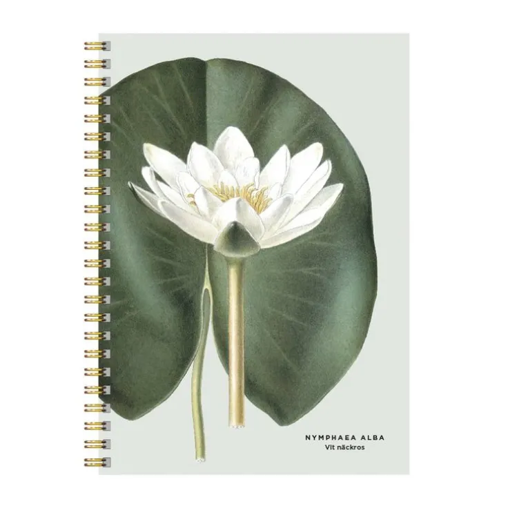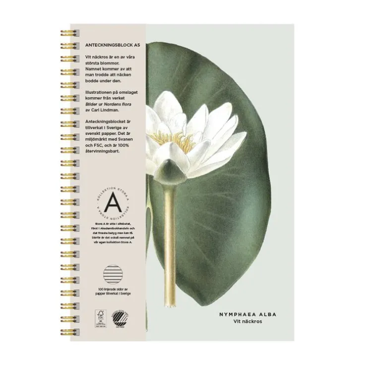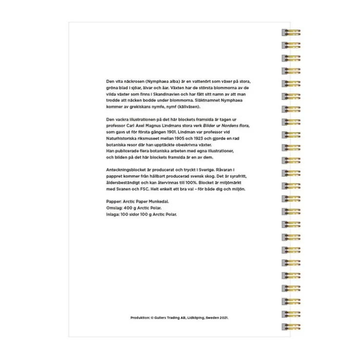 Om anteckningsblockets motiv: Den vita näckrosen (Nymphaea alba) är en vattenört som växer på stora, gröna blad i sjöar, älvar och åar. Växten har de största blommorna av de vilda växter som finns i Skandinavien och har fått sitt namn av att man trodde att näcken bodde under blommorna. Den fina illustrationen på anteckningsblockets framsida är tagen ur professor Carl Axel Magnus Lindmans stora verk Bilder ur Nordens Flora som gavs ut för första gången 1901.