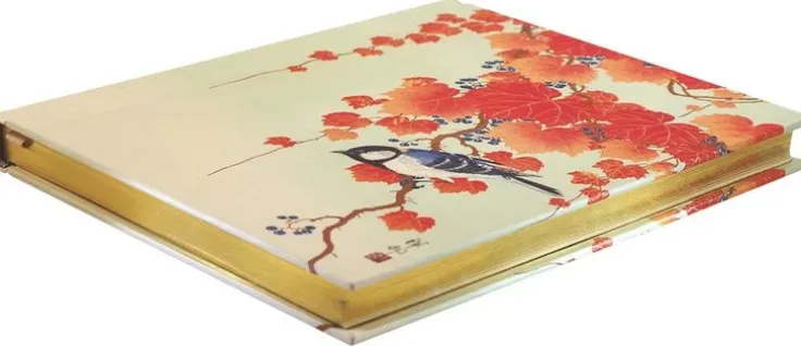 En stor anteckningsbok med både präglat och guldfolierat bokomslag. Anteckningsboken innehåller 192 ljust linjerade sidor och de är gräddvita. Sidornas kanter är guldfolierade. Boken har en sidmarkör i satin i matchande färg. Bokomslagets insidor är fodrade i vacker röd färg. Det underbara motivet med titeln Tit on Paulownia skapades 1934 av konstnären Ohara Koson. En skogsfågel sitter på stammen av paulownia, känd i Japan som ”prinsessträdet” bland röda löv och blå bär.Boken passar fint som dagbok eller som gästbok. Man kan inte se sig mätt på det vackra omslaget!
