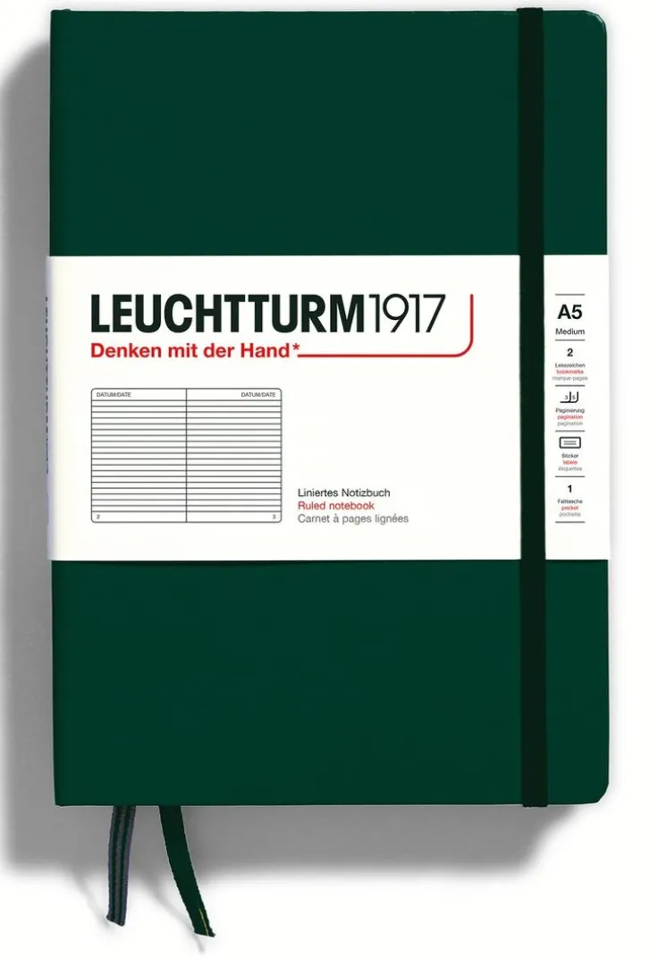 Notebook från Leuchtturm1917 – en anteckningsbok i praktiskt A5-format med 251 linjerade och numrerade sidor varav 8 sidor är perforerade och löstagbara. FSC-certifierat och ink-proof (80g) papper. Märkband och förvaringsficka. Resårband runt boken. Notebook från Självhäftande etiketter för märkning och arkivering. Färg: Forest Green