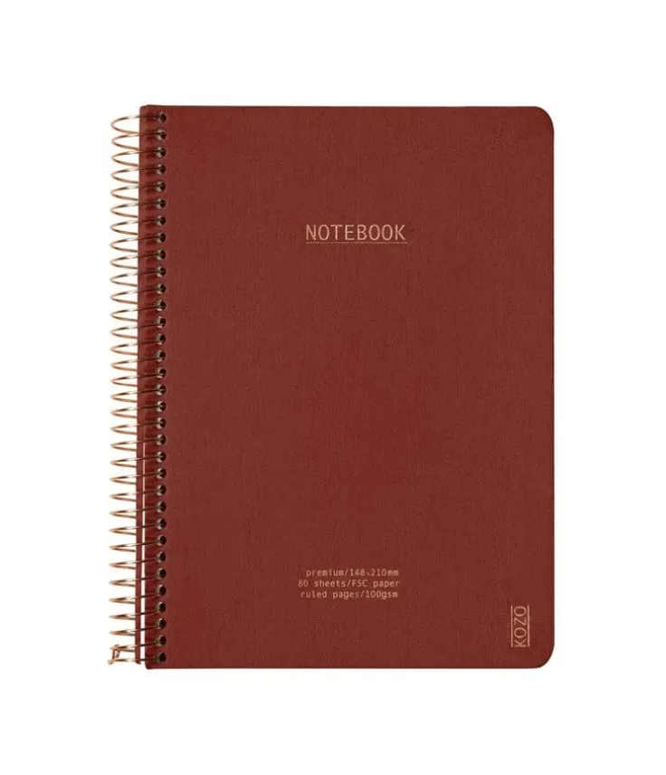 KOZO Premium anteckningsbok är definitivt en av de snyggaste anteckningsböckerna på marknaden. Det kraftiga canvasomslaget med vackra detaljer i brons och den kaxigt stora spiralen, även den i brons, gör den perfekt att skriva och ta anteckningar i, både när du har den liggandes i knät eller till och med stående utan stöd. Och givetvis en vacker inredningsdetalj till ditt skrivbord. Att skriva på det cremefärgade 100 g pappret ger en lyxig känsla. Alla 80 sidor i anteckningsboken har en datumrad uppe till höger, enkelt och praktiskt. Matchar alla andra KOZO skrivbordsartiklar i samma färgnyanser.