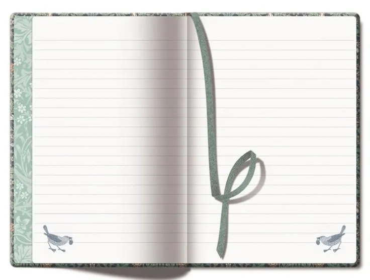 En inbunden anteckningsbok i A5 storlek med ett vackert hårt omslag i William Morris mönster, som heter Blackthorn. Omslaget är i linnestruktur och har även guldfolierade detaljer. Anteckningsboken innehåller 96 linjerade sidor med en liten fågel från ett av William Morris mönster i nederkant. Sidornas kanter är guldfolierade. Boken stängs med en elastisk snodd och anteckningsboken har en sidmarkör i matchande färg. Insidan av bokomslaget är fodrat i matchande mönster.