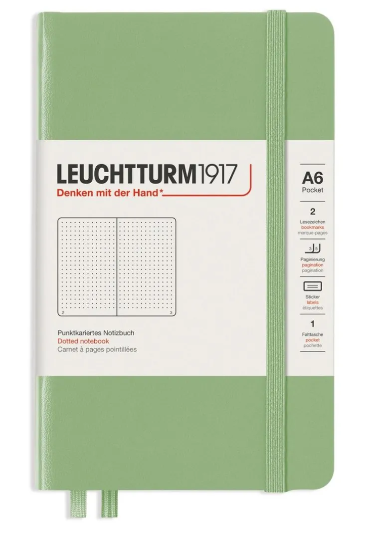 Notebook från Leuchtturm1917 – en anteckningsbok i A6-format med 185 prickade (dotted) numrerade sidor varav 8 sidor är perforerade och löstagbara. FSC-certifierat och ink-proof (80g) papper. Märkband och förvaringsficka. Resårband runt boken. Självhäftande etiketter för märkning och arkivering. Färg: Sage