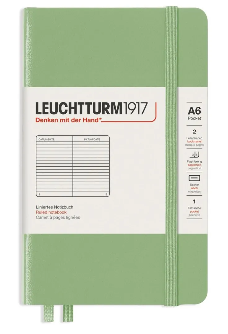 Notebook från Leuchtturm1917 – en anteckningsbok i A6-format med 185 linjerade numrerade sidor varav 8 sidor är perforerade och löstagbara. FSC-certifierat och ink-proof (80g) papper. Märkband och förvaringsficka. Resårband runt boken. Självhäftande etiketter för märkning och arkivering. Färg: Sage