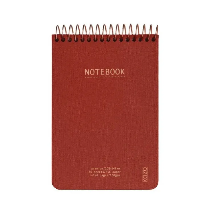 KOZO Premium anteckningsbok är definitivt en av de snyggaste anteckningsböckerna på marknaden. Det kraftiga canvasomslaget med vackra detaljer i brons och den kaxigt stora spiralen, även den i brons, gör den perfekt att skriva och ta anteckningar i, både när du har den liggandes i knät eller till och med stående utan stöd. Och givetvis en vacker inredningsdetalj till ditt skrivbord. Att skriva på det cremefärgade 100 g pappret ger en lyxig känsla. Alla 80 sidor i anteckningsboken har en datumrad uppe till höger, enkelt och praktiskt. Matchar alla andra KOZO skrivbordsartiklar i samma färgnyanser.
