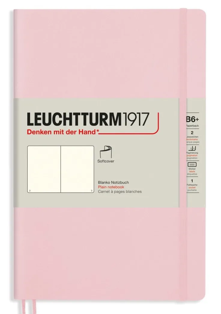 Leuchtturm1917 – en anteckningsbok med mjuk pärm och det lite mindre formatet B6, perfekt storlek att ta med sig i väskan. 123 olinjerade och numrerade sidor. Ink-proof 80 g FSC-certifierat papper. Två märkband och praktisk elastisk snodd för att hålla boken stängd. Expanderbar förvaringsficka på bakre pärmen. Medföljer även etiketter för märkning och arkivering. Färg: Powder