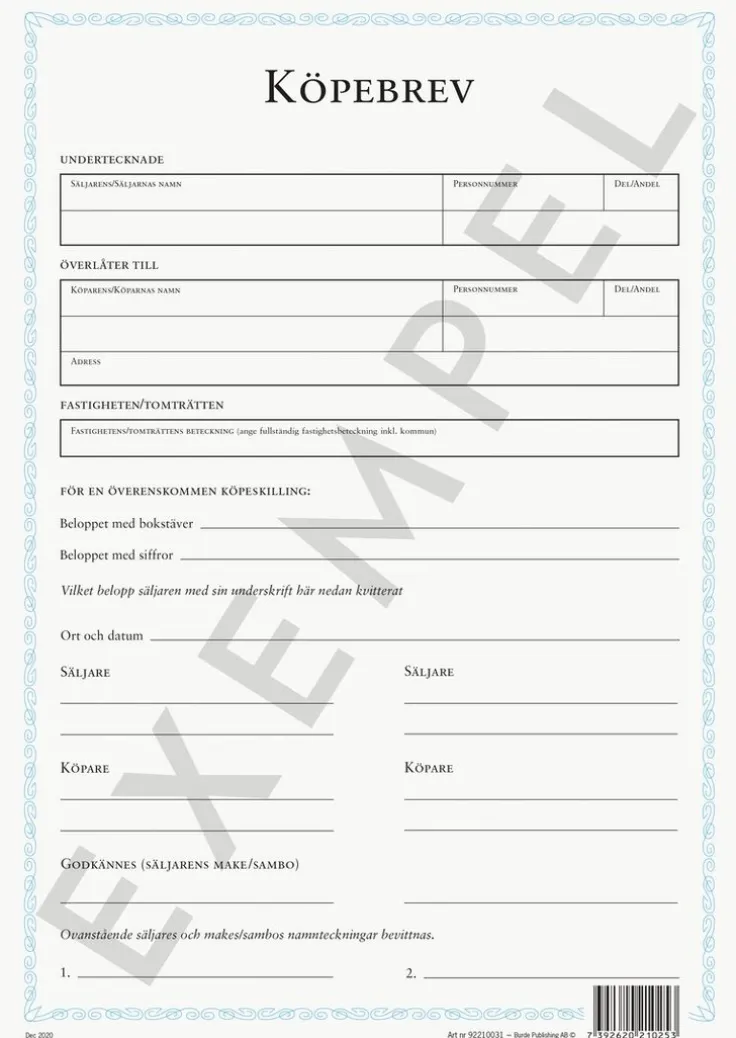 Blankett. Köpebrevet innehåller de obligatoriska uppgifterna för att användas vid lagfartsansökan. Format: A4.