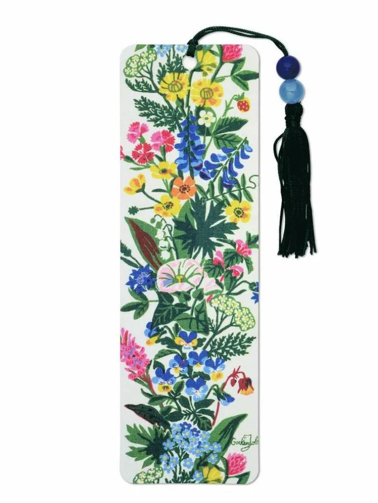 Bokmärke med tofs och två pärlor. Detalj av välkända Gocken Jobs (1914-1995) vackra mönster Dikesflora. Rundade hörn. FSC märkt papper. Kommer i en plastficka.