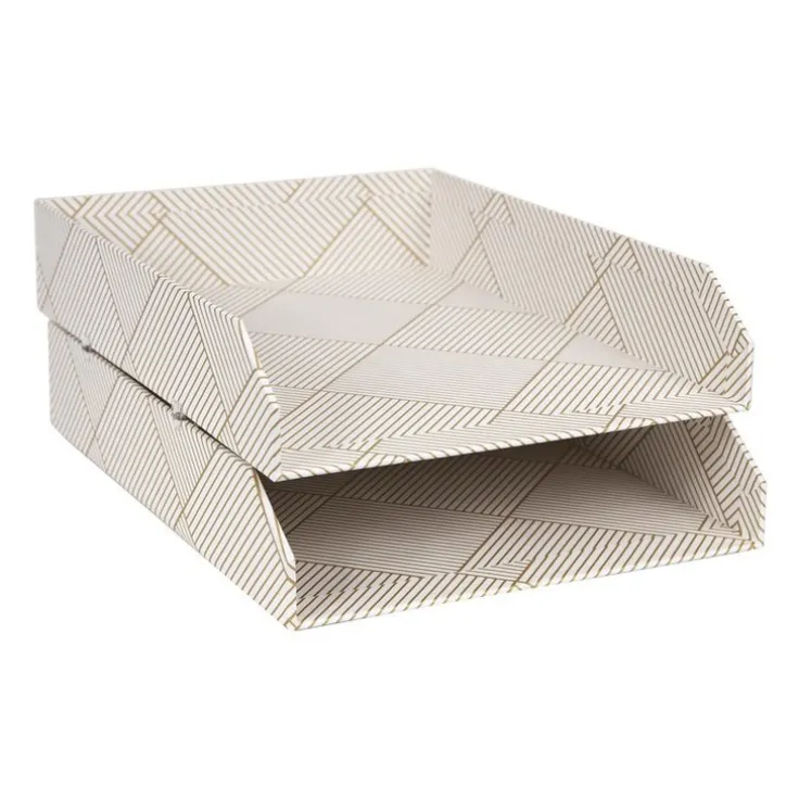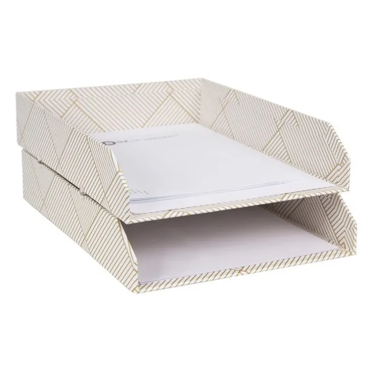 Brevkorgen Håkan I A4 från Bigso Box of Sweden. Brevkorg i två delar med medföljande clips för att enkelt stapla delarna på varandra. Antiglidfötter medföljer till undersidan för stabilitet. Tillverkad i återvunnen fiberboard med ytskikt i lyxigt papperslaminat i vit och guld mönster. Mått: 31x23x6/12cm. Kombinera gärna med Lena skrivbordsställ.