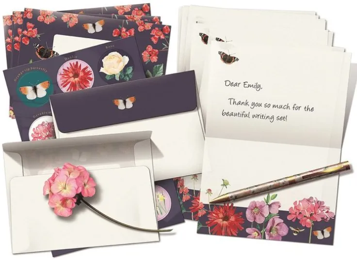 Brevpapper i en folder med flera fack. Brevpappret innehåller 30 pappersark i A5 storlek, 15 kuvert samt ett ark med 12 klistermärken. Foldern stängs med en magnet och foldern kan användas till minnen eller annat när brevpappret är slut. Foldern har ett fint mönster med lackade detaljer. Mönstret på foldern går igen på kuverten och i nederkant på pappersarken.